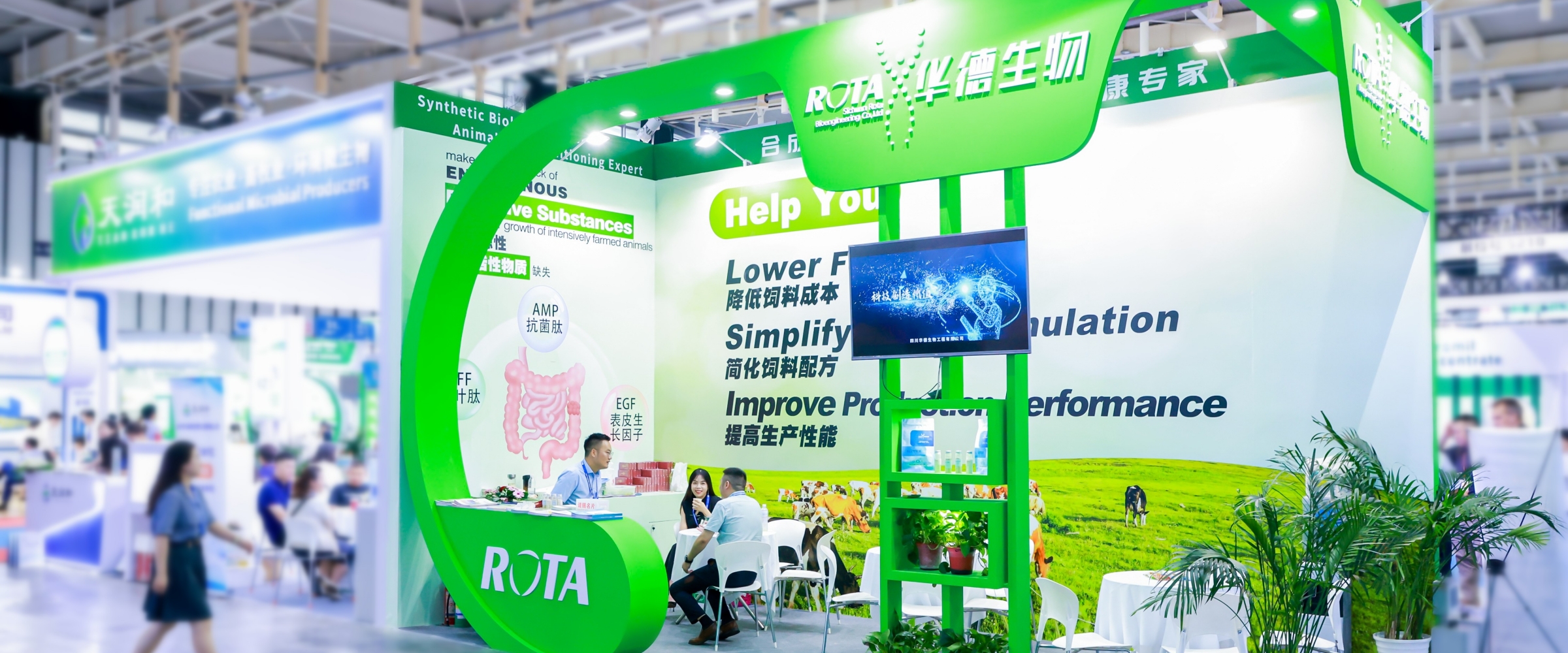 此次展会,参展企业350余家,展出面积36000余平方米,饲料原料、饲料添加剂、饲料加工、兽医动保、智能养殖、屠宰加工、优质畜禽产品等板块的头部企业、领军企业、新锐企业集聚,吸引了众多国内、国际客商的到来。华德生物携“Ecotide(维乐宝)”,“Tipek(态贝康)”等众多产品惊艳亮相会场,吸引了众多客商的关注。